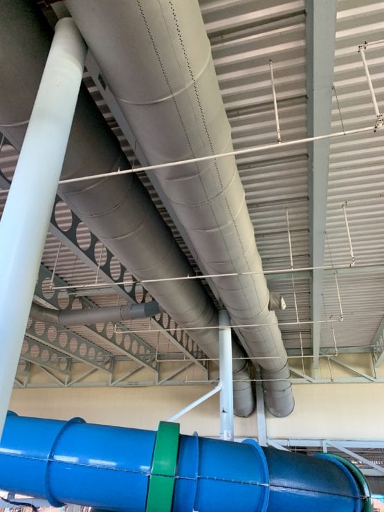 The DuctSox components were secured by a special support system that’s specified for unique pool environments. For pool applications, a plastic-coated impregnated cable is used for installation. Each part of the cable is individually coated in waterproof polypropylene, then wound together to increase support. The support cable will successfully withstand corrosion, abrasion, and deformation over time.