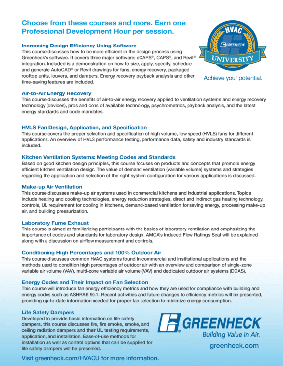 Additional classes will be posted on Greenheck.com>Resources>Education>HVAC University.