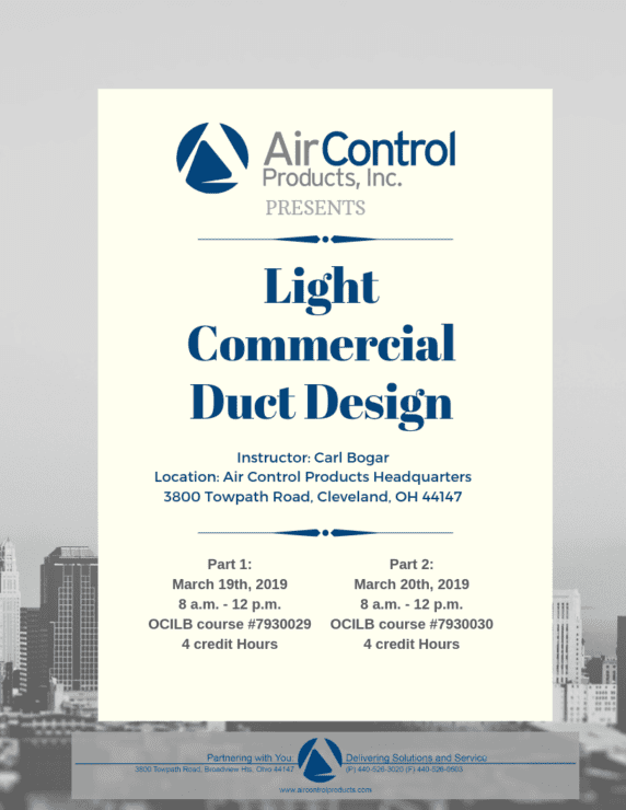 OCILB Course: Light Commercial Duct Design By [email protected] | March 1, 2019 Email [email protected] to sign up or if you have any questions. SYLLABUS FOR LIGHT COMMERCIAL DUCT DESIGN CLASS Posted in Industry Events