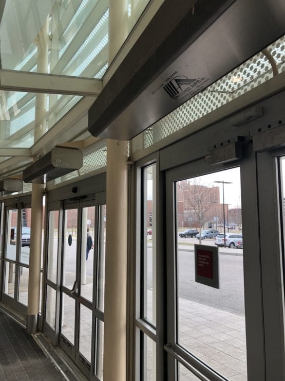 A wonderful representation of Powered Aire air curtains used at the Cleveland Clinic Cole Eye Institute. These air curtains help maintain the temperature inside the office and reduce the cold air that enters the building when doors are open. Contact Air Control Products at 440.526.3020 for your application!