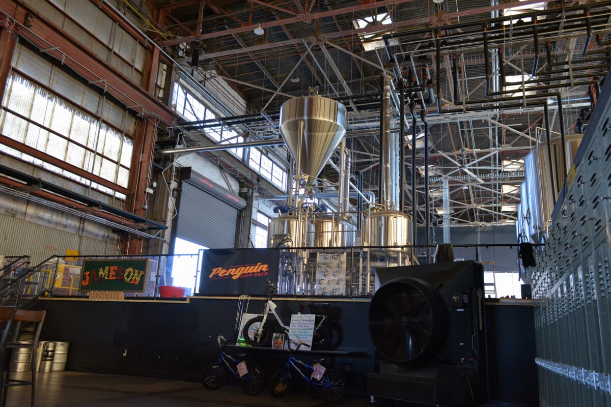 Interior view of a large industrial brewery with stainless steel tanks and a network of pipes. A large sign reading 'JAMESON' is made from bottle caps, and there is also a 'Penguin City Beer' banner. The ceiling has a grid of metal beams and overhead lights.