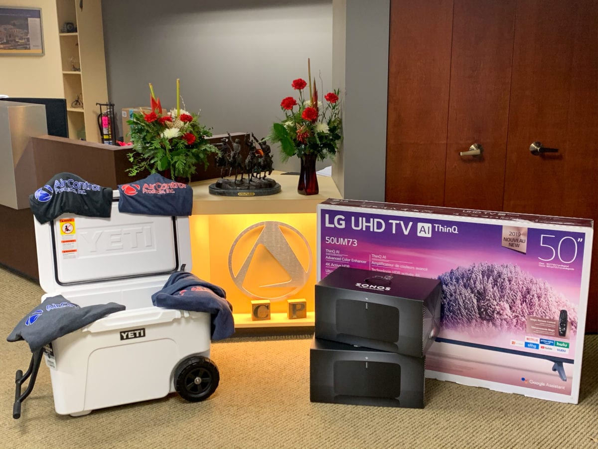 The donations didn't stop with our innovative products. We participated in the 2019 SMACNA Holiday Appreciation Dinner. We proudly gave away a bunch of cool gifts, including Yeti Coolers, Sonos Speakers, Air Control Product apparel, as well as a big screen tv!